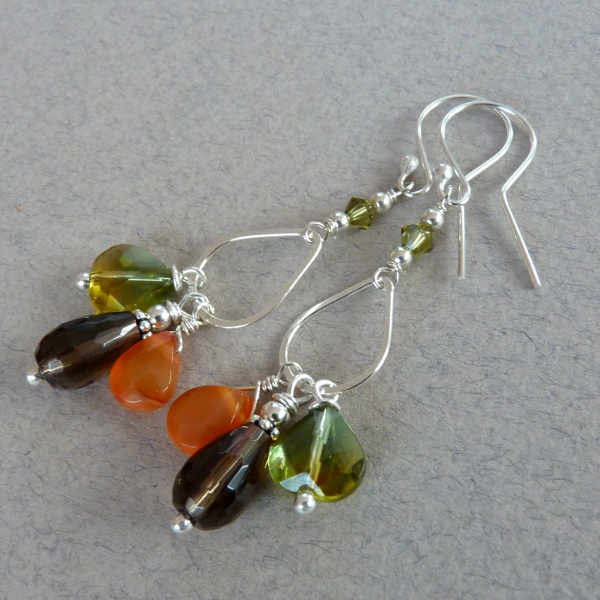 Urocze, optymistyczne kolczyki wykonane w całości ze srebra próby 925 i 930 oraz kropli kwarcu dymnego, pięknie wybarwionego karneolu i kryształu górskiego oraz kryształków bicone Swarovskiego ( 4mm). Całkowita długość kolczyków 6,5 mm. Biżuteria zostanie wysłana w ozdobnym opakowaniu